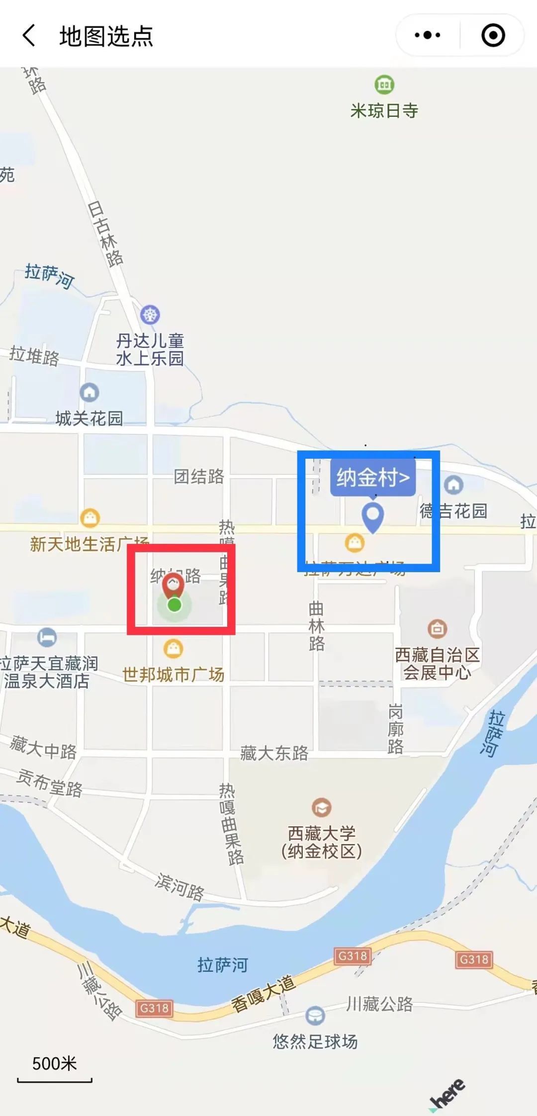 第三步:紅色位置,為搜索地點自行輸入地址定位點;藍(lán)色位置,為你所定位地點的管控街道(鄉(xiāng))和社區(qū)(村),請點擊。
