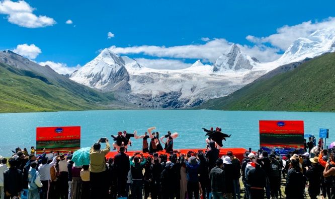 天高地闊,白云祥和,雪山巍然;清風(fēng)徐徐,青草依依,湖水湛藍(lán)。薩普雪山融水匯聚成一條清澈的河,從眼前激流直下。7月15日上午,一場別具特色的文化旅游賽事活動在這里拉開序幕。一場慷慨激昂、內(nèi)容豐富的主題推介演講,一首首悠揚(yáng)高亢、直擊心靈的民族歌曲,一幕幕輕盈靈動、鏗鏘有力的特色舞姿,引得現(xiàn)場數(shù)百名觀眾一陣陣掌聲雷動和直播間數(shù)十萬用戶點贊、好評不斷,成功向區(qū)內(nèi)外推介了比如縣得天獨厚的旅游資源和特產(chǎn)資源,為旅游事業(yè)和經(jīng)濟(jì)社會高質(zhì)量夯實了宣傳工作基礎(chǔ)。